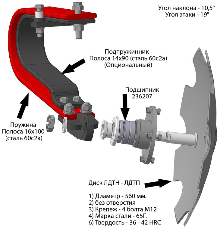 - Лущильник оснащён двумя рядами сферически вырезных дисков (в народе ромашка), толщиной 6 мм., диаметром 485 мм., из стали марки 65 Г.