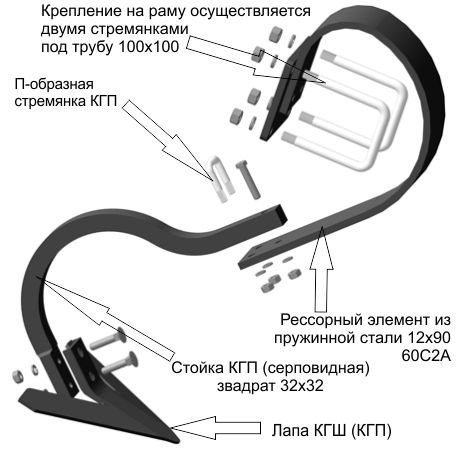 - Корпус культиватора КГП - представляет собой уникальный запатентованный узел, состоящий из крепёжно-регулирующего и пружинного механизма, которая в свою очередь состоит из двух типов пружин, спиралевидная (диаметр 12мм.) и С-образная (дуговая с сечением 20x45). .