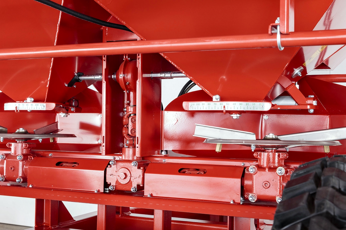 Двухдисковые разбрасыватели предназначены для поверхностного внесения минеральных гранулированных и кристаллических удобрений на сельскохозяйственных угодьях, как в малых, так и в крупных сельских хозяйствах. Машины характеризуются высокой надежностью и, что также важно, равномерностью и точной регулировкой высева. Рассеивающие диски оснащены двумя парами лопастей, позволяющими рассеивать удобрения в пределах рабочей ширины 10-28 м.