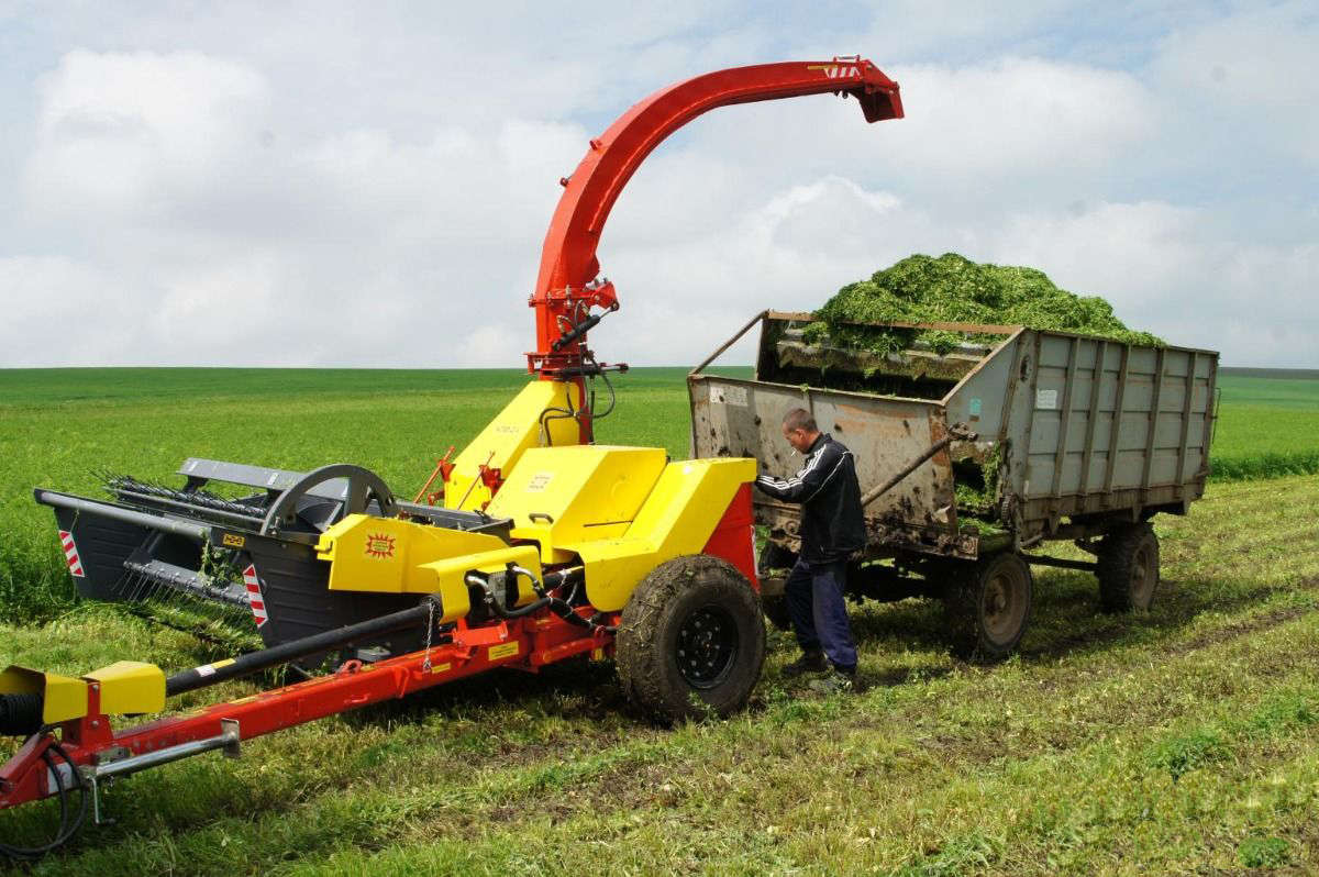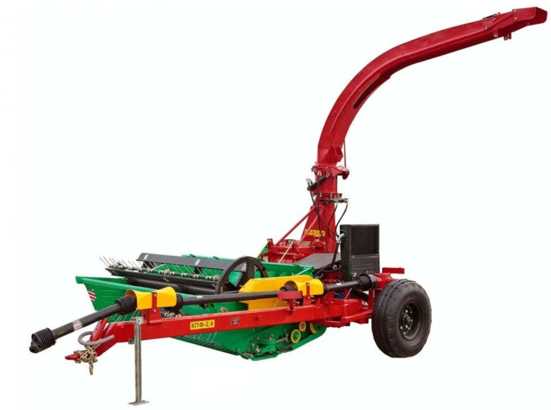 Комбайн КПФ -2,4 скашивает и подбирает из валков подвяленные сеяные и природные растения, скашивает кукурузу и другие высокостебельные культуры с одновременным их измельчением и погрузкой в транспортные средства. Широкий диапазон измельчения позволяет использовать растительную массу на силос для непосредственного кормления животных, заготовка сена, гранулированных и брикетированных кормов и травяной муки. Комбайн состоит из прицепного измельчителя и сменных рабочих органов: подборщика, жатки для кошения трав и жатки сплошного среза для уборки кукурузы.